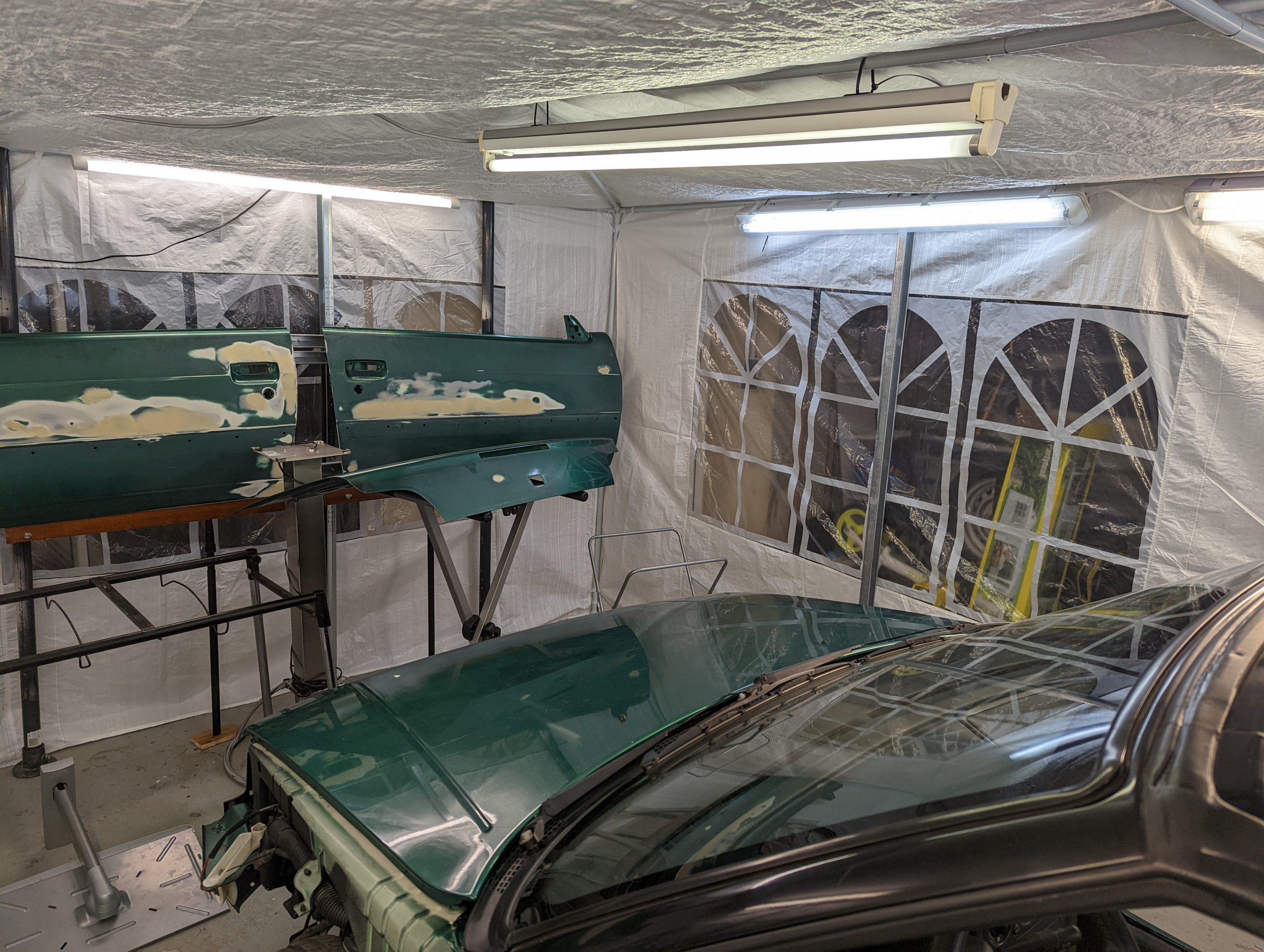 Donc ma première étape à été de créer ma propre cabine de peinture avec une tonnelle bon marché de 6×3 avec un maximum de lumière (8 néons achetés sur le bon coin) et une grande bâche au sol.