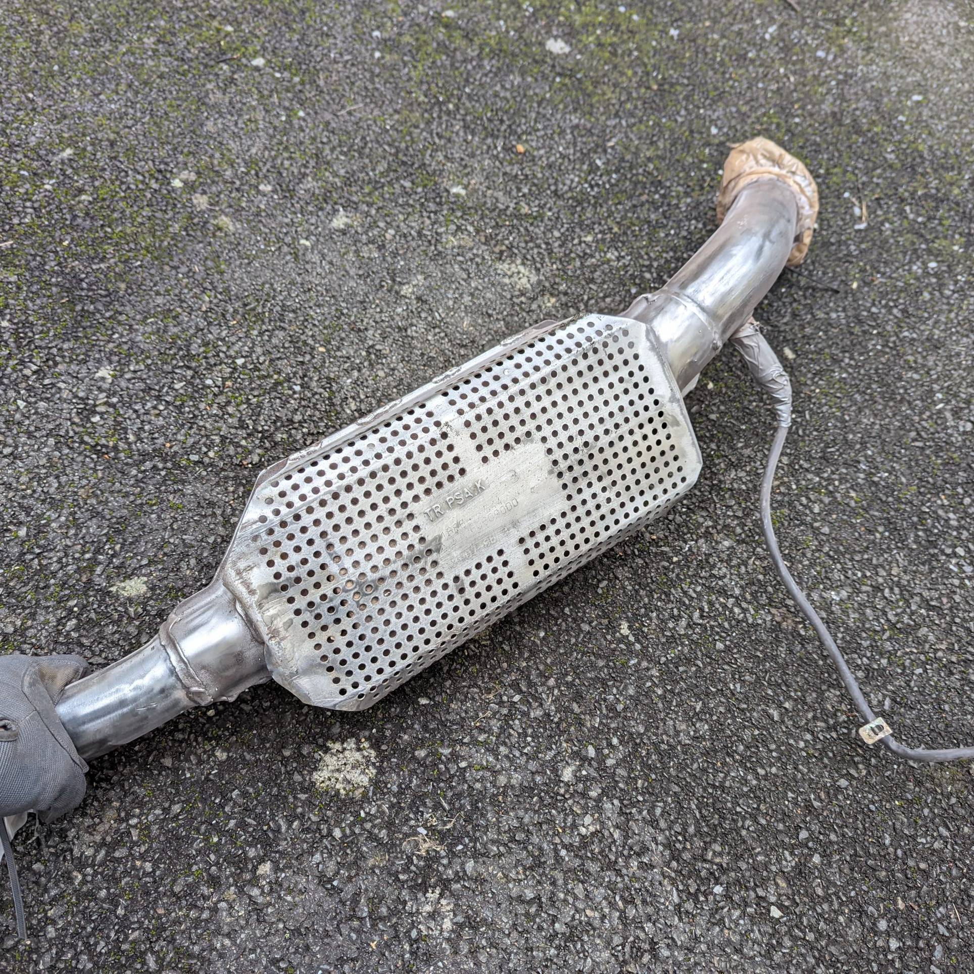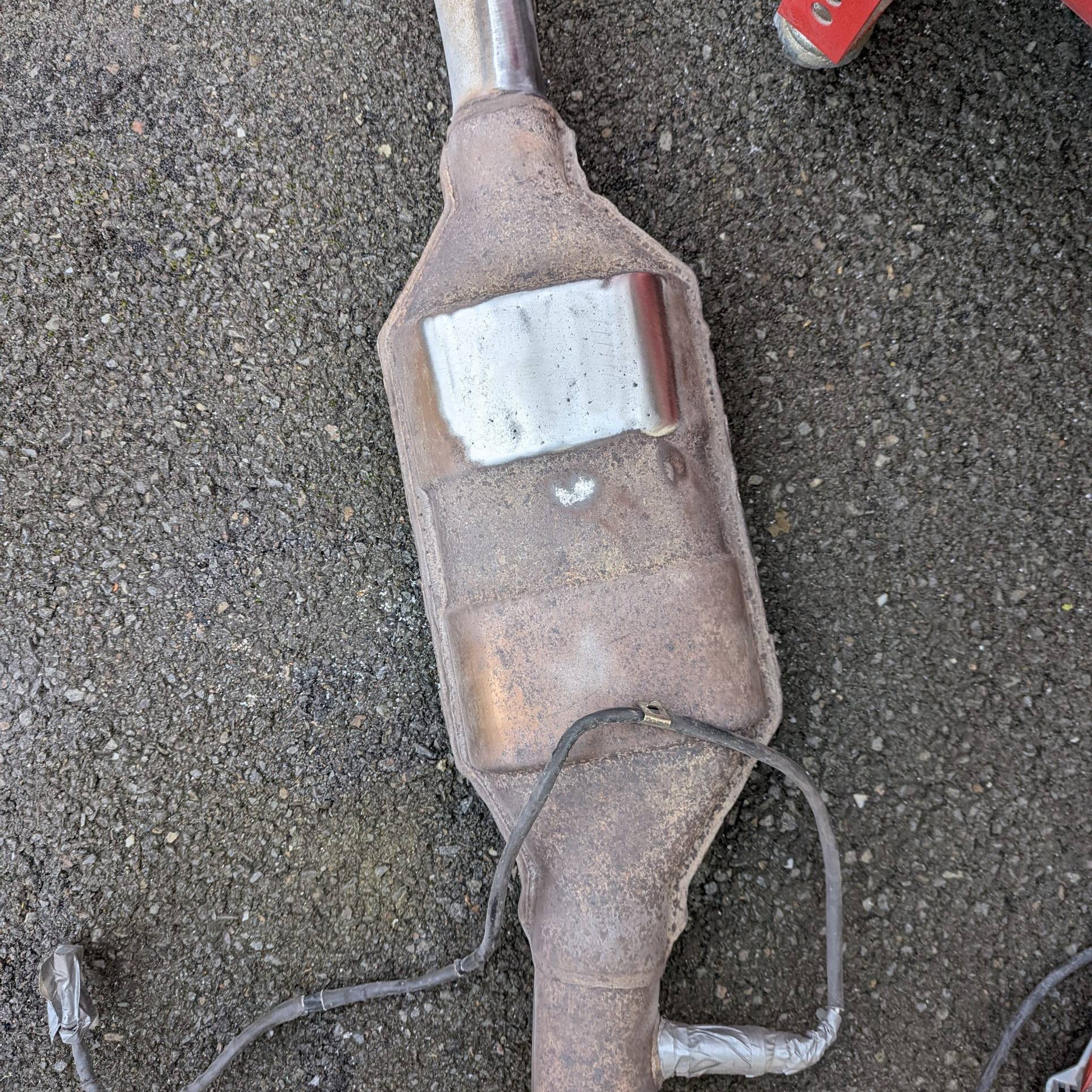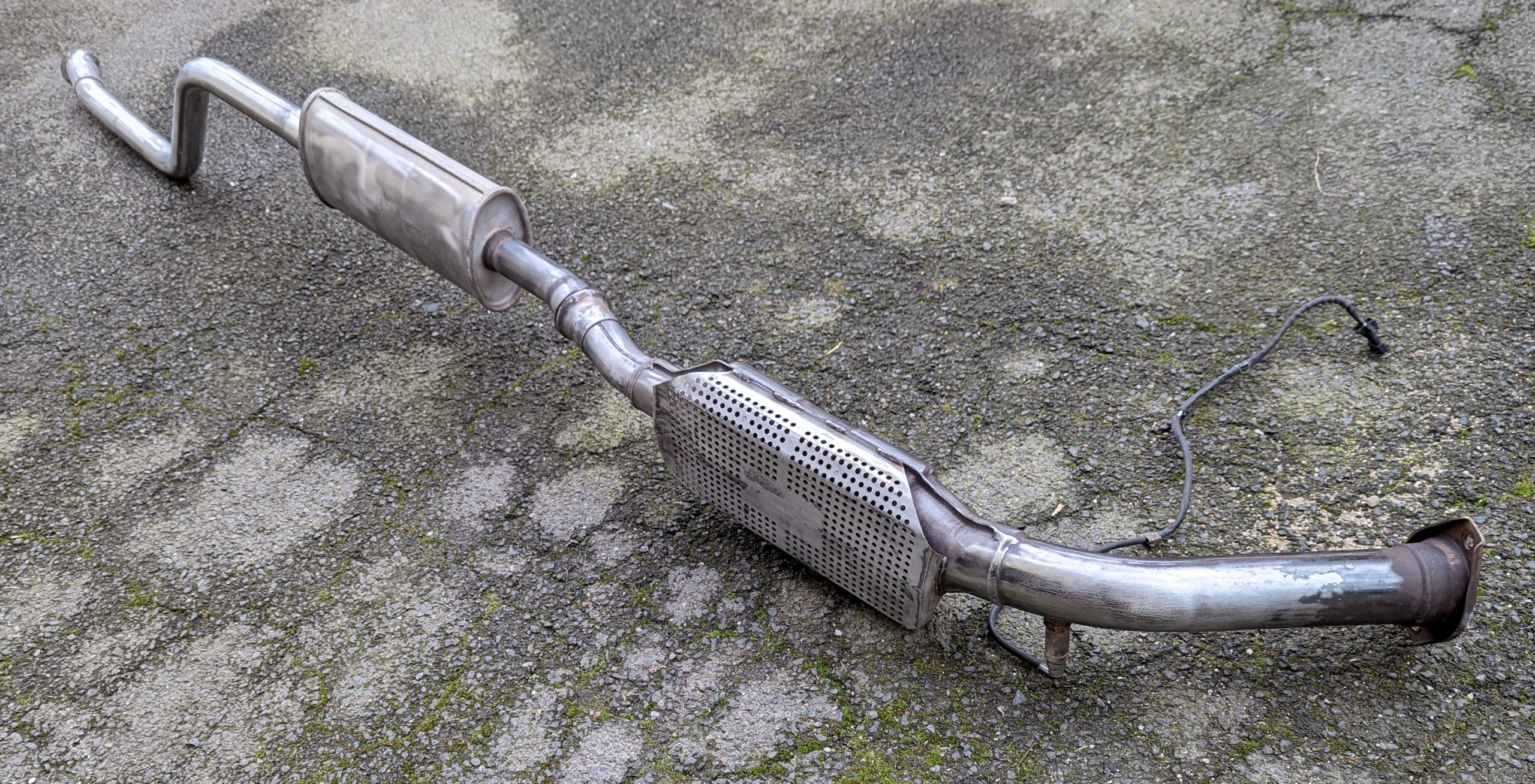 Dans l’ensemble, le catalyseur, le silencieux intermédiaire, et le silencieux arrière sont rouillés mais ils restent en bon état. Je vais donc les sabler au préalable, puis passer un coup de meuleuse munie d’une brosse métallique. Je finis l’opération au papier de verre (P500).