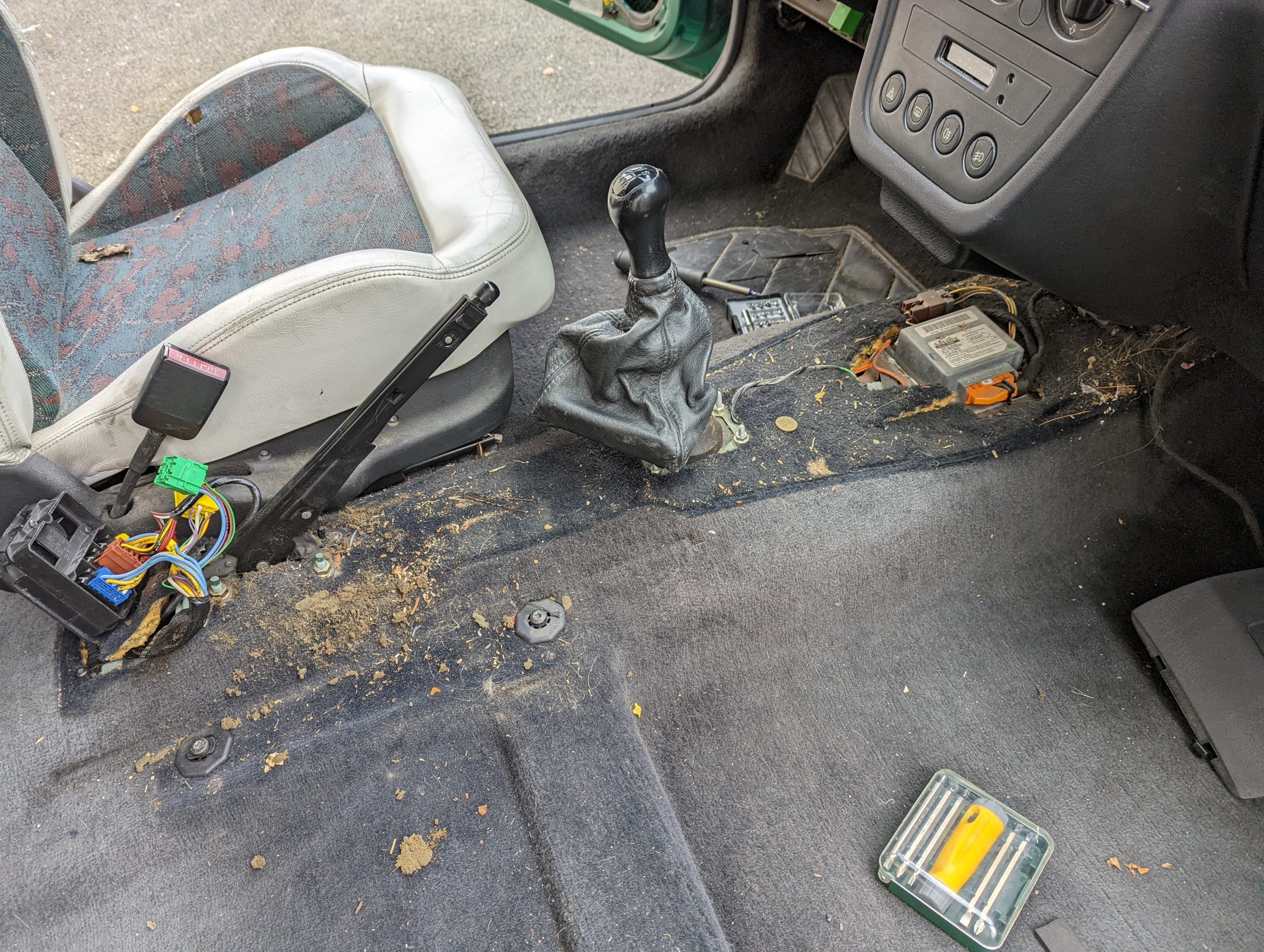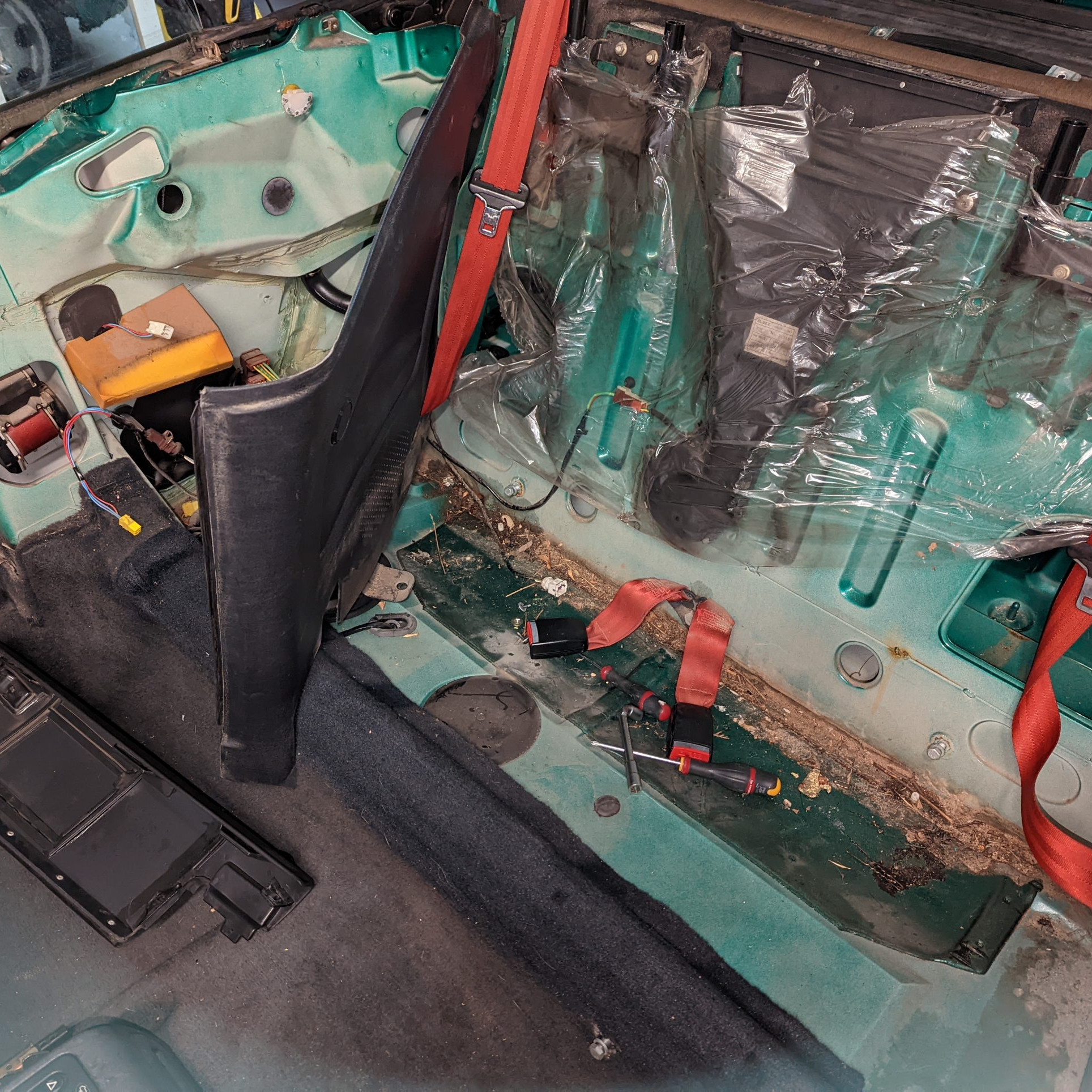 Comme pour le moteur, on peut dire que la dépose complète et le nettoyage de l’intérieur (sièges, ceintures, panneaux de portes, vitres) va lui faire le plus grand bien.