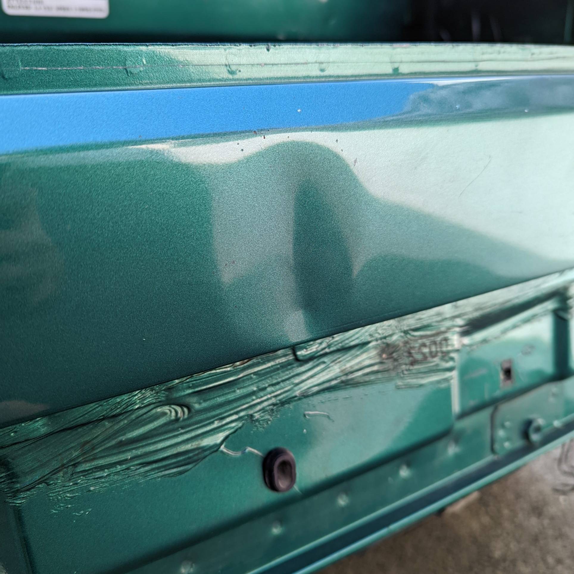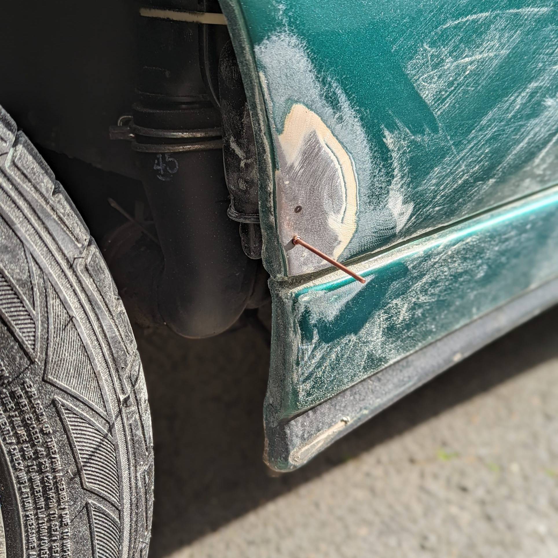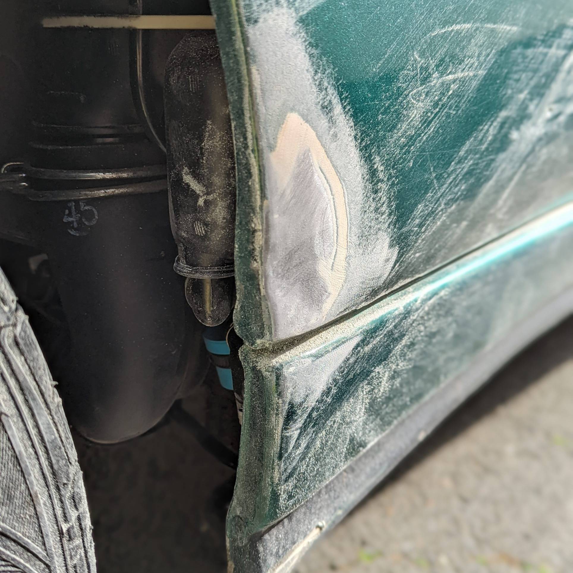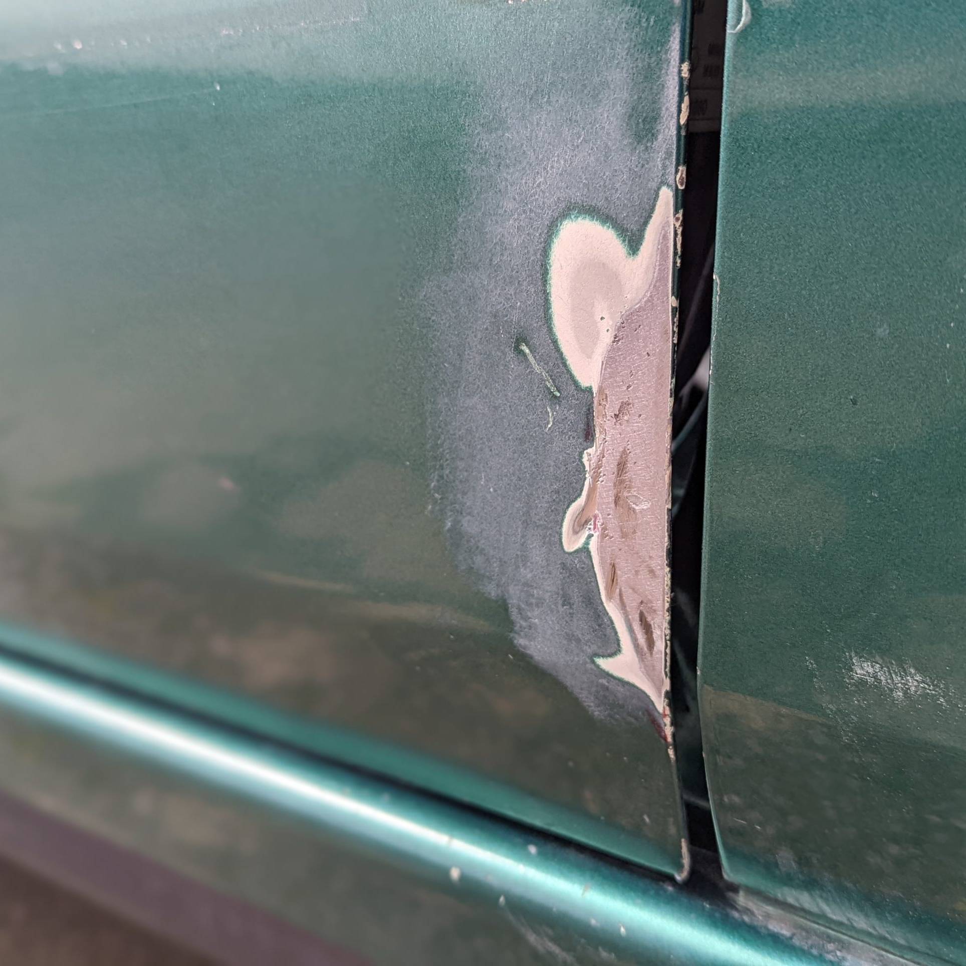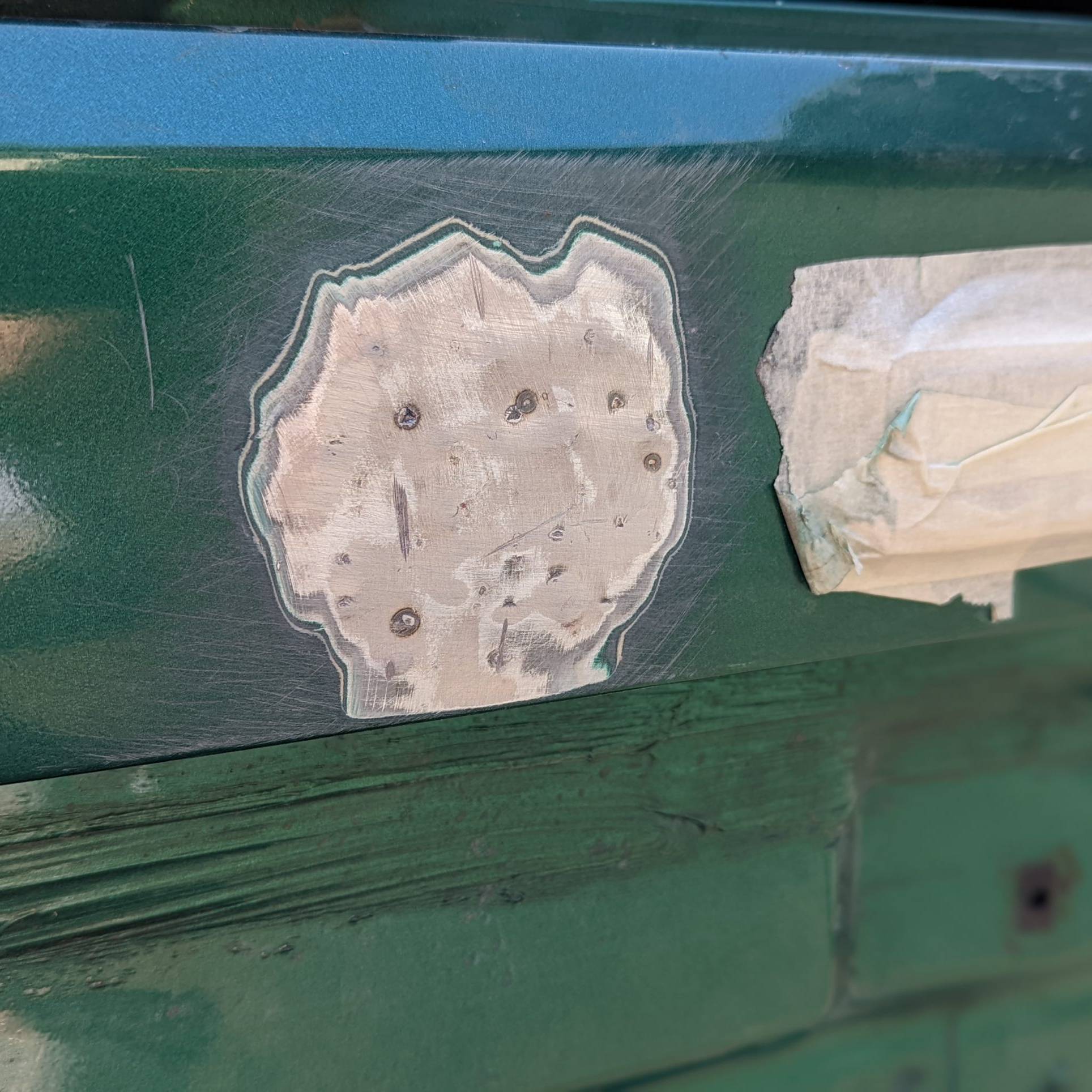 Dernière zone où j’utilise mon tire-clou. Après ponçage pour atteindre la tôle, je peux voir qu’il y a déjà eu une précédente intervention et que la zone enfoncée avait été comblée avec une forte épaisseur de mastic.
