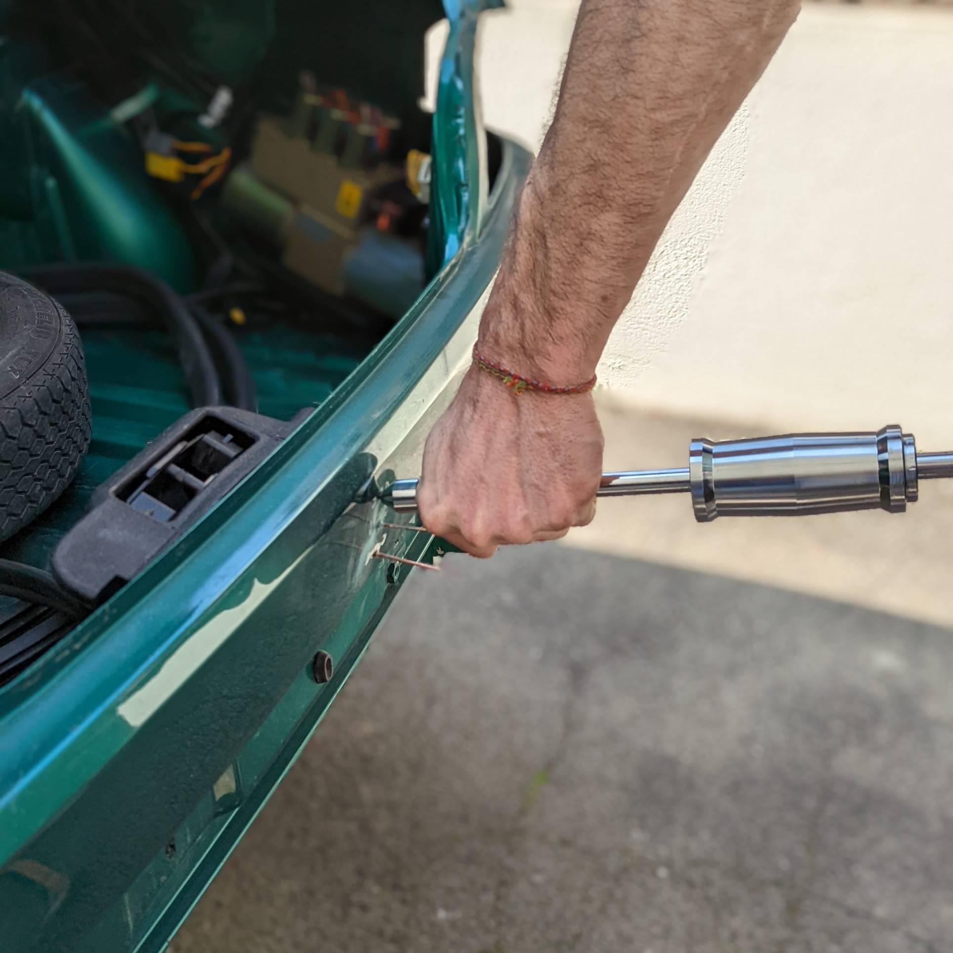 Je m’attaque d’abord aux 2 gros enfoncements au-dessus du pare-chocs arrière et c’est une première occasion de baptiser le tire-clou.