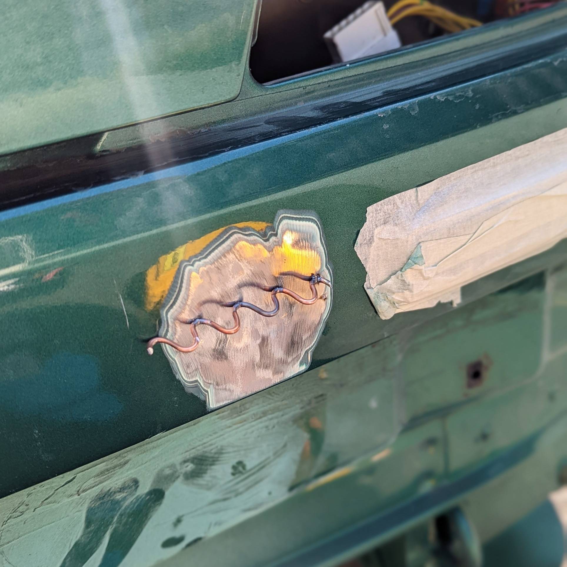 Même procédé que précédemment. Je délimite les zones à redresser et je décape pour atteindre la tôle avant de souder.