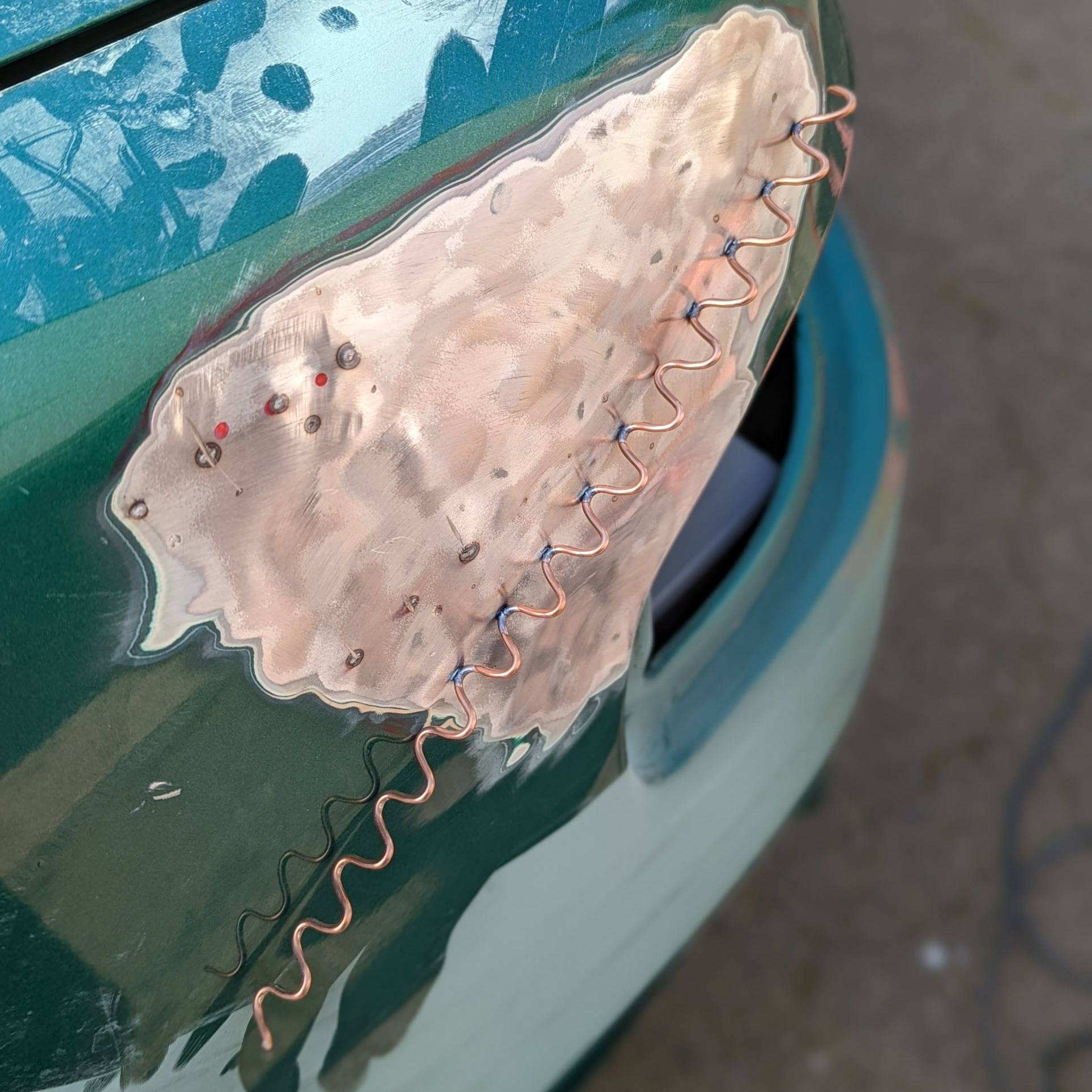 J’ai ensuite peaufiné avec un marteau et une cale puis j’ai soudé à nouveau quelques clous pour redresser les zones inaccessibles de l’intérieur (tôles en sandwich).