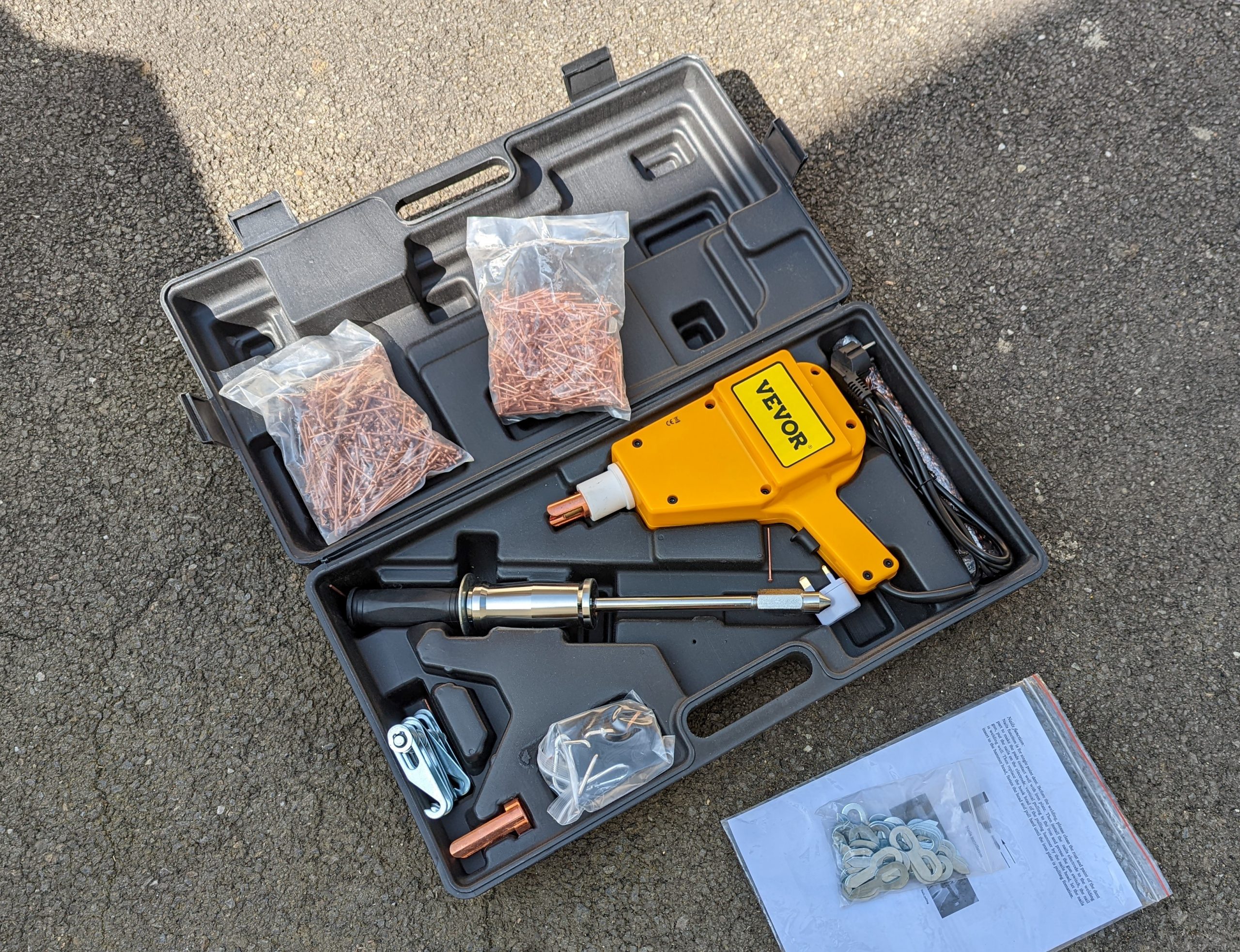 Mais pour les angles plus saillants ou les gros enfoncements nécessitant une force de traction beaucoup plus importante, j’ai utilisé un tire-clou qui consiste à souder des clous (ou des fils ondulés) directement sur la carrosserie pour pouvoir ensuite tirer dessus et redresser la tôle.